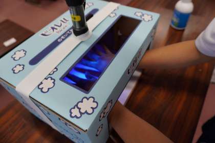 「時間がなくてサッとしか手洗いができない状況」という条件の中で,子ども達にはブラックライトに反応するクリームを塗り,水洗いをしてから洗えているのかを確認してみました。