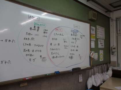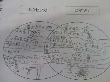 今日は今まで育てていたヒマワリとホウセンカをベン図を使って比べてみました。「育ち方は同じなんだね。」「葉の形は違ったよ。」と2つを比べて考えることができていました。
