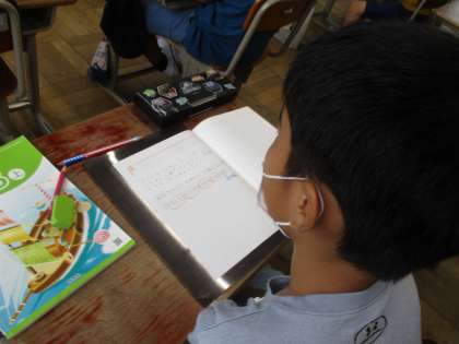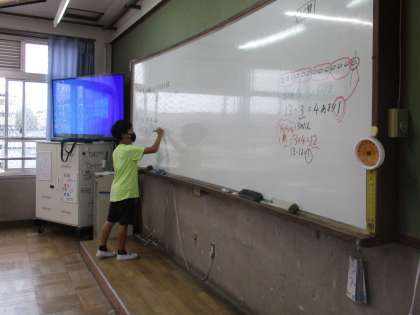 あまりのあるわり算の学習が始まりました。わられる数が九九にはないので戸惑いもあるようですが,図をかきながら式とつなげて一生懸命説明しようとする姿が見られました。