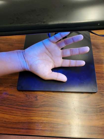 クリームを手につけ,ライトを当てると汚れが白く見えるという器具を使い,普段と同じように手洗いをすると,どの程度汚れが残っているのかを調べました。