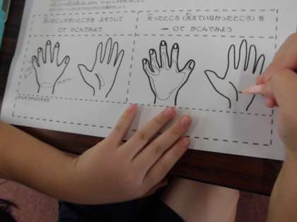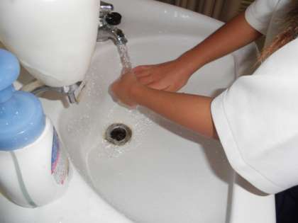 身体計測の時間に,手洗いの大切さを学習しました。まほうのクリームを手にぬって,手洗いし,ブラックライトで照らすと,白く洗い残しが浮かび上がってきます。最後に汚れがとれにくいところを意識し,手洗いをしていました。