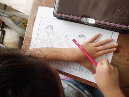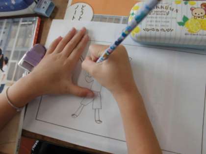 体育科授業参観でのプログラムの絵を2年生が担当します。体育科授業参観の様子をイメージして,絵を楽しんでえがいていました。
