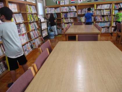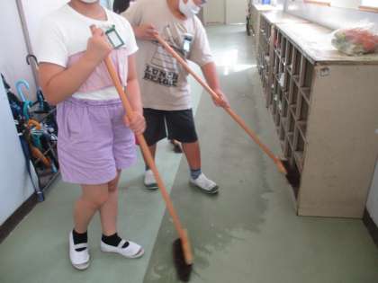 掃除の時間,靴箱周辺,階段,図書室の掃除を頑張っていました。