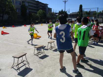前回雨で流れたためできなかったリレーをしました。各チーム作戦を立てて工夫しながら活動していました。