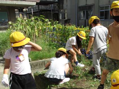 1学期から野菜を育てていた畑の草抜きをしました。