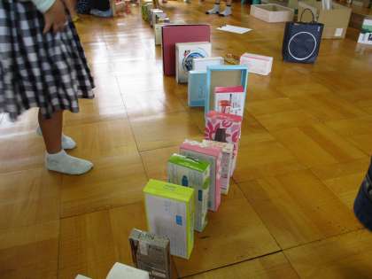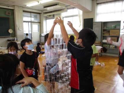「ためしてあそんでくふうして」では,さまざま材料を使い,楽しくかつどうしています。ドミノたおしをしたり,ピラミッドをつくったりしていました。