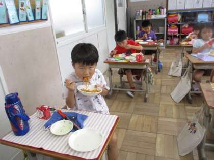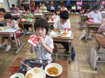 今日の給食は,「イタリアンスパゲティ」。1年生の子どもたちは,「おいしい!」「もっと食べたい!」と大喜び。おかわりもたくさんしました。毎日の給食が楽しみです。