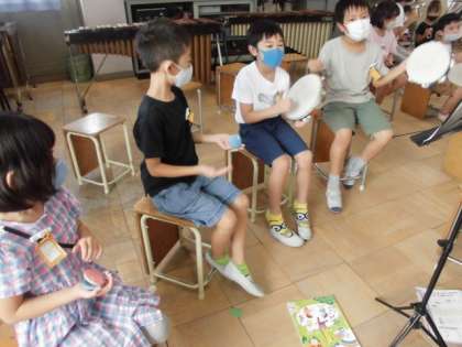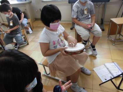音楽に合わせて,タンブリンとカスタネットををつかって2拍子のリズムをうちました。