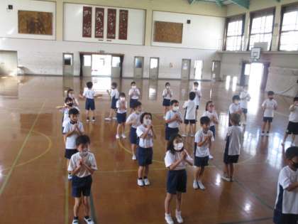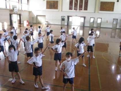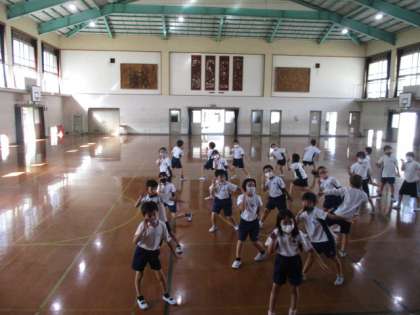 体育でリズムダンスの練習をしています。ダンスの振りも覚えてきて,細かいところに注意しながら踊る様子がみられました。