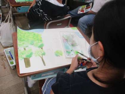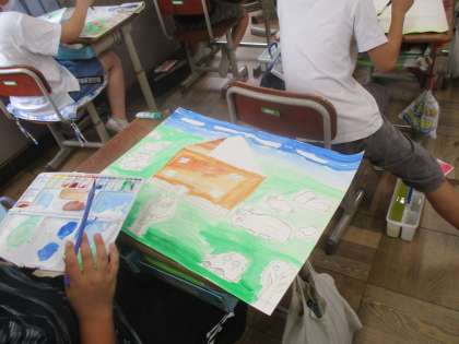 図工では,下書きした作品に色付けをしました。
