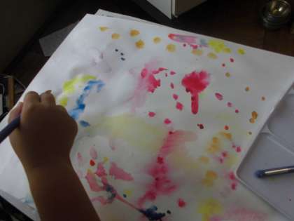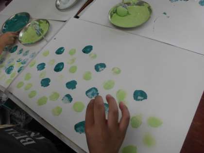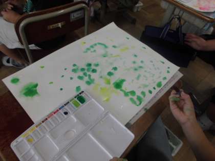 絵にあらわしたい場面を決めたあと,場面にあった色画用紙作りをしました。「にじみ」をしたり,「スタンピング」したり,好きな色の色画用紙を選んだりしました。きれいな色画用紙ができあがりつつあります。