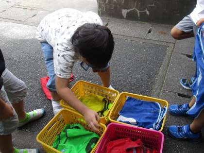体育の時間に使ったビブスは洗濯をしてきれいにたたんで次の人が使えるように準備をしています。子どもたちが進んで,1枚ずつ風に飛ばされないように干して,丁寧にたたんでくれる姿に感心させられました。
