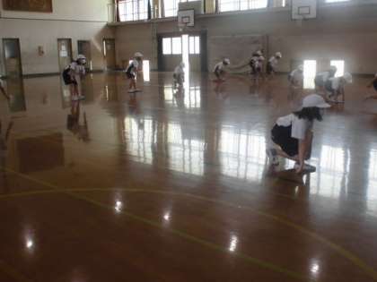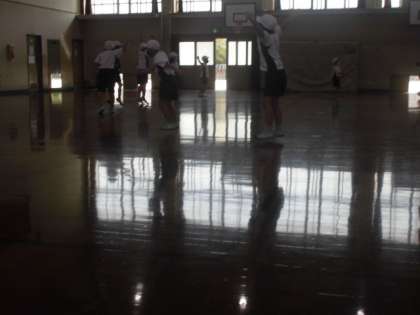 今日は体育館で隊形をかえておどりました。まっすぐ並んだり,円になっておどったり,三角形になったり。はじめての隊形移動も思ったよりスムーズに動くことができました。みんなで協力してできたと思います。