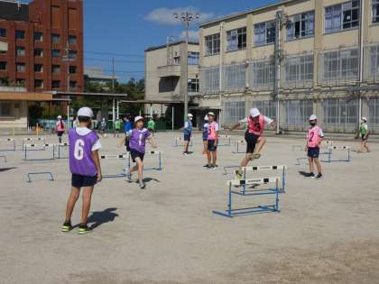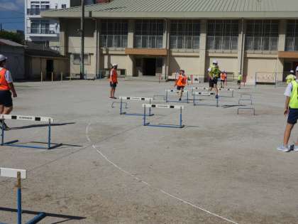 最後のハードル走の学習が終わりました。最初のころにくらべて,タイムが一回でも縮んだ子がたくさんいました。