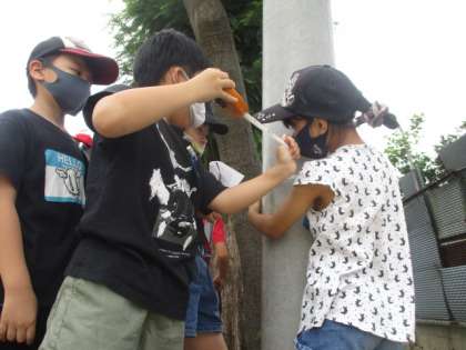 算数の長さの学習で,巻尺を使い,教室や木のまわりの長さを測る活動をしました。巻尺を垂直にしないといけないことや,たるまないように持つことの大切さに気づくことができました。