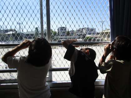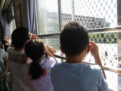 今日は教室から遮光板を使って太陽を見ました。「太陽って意外と小さいんや。」「赤のイメージがあったけど,オレンジ色に見える!」など,新しい発見があったようです。