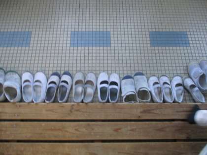 どの子どもも図書室の前で靴をきちんとそろえて脱ぎ,