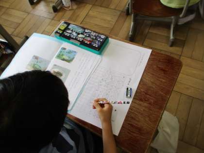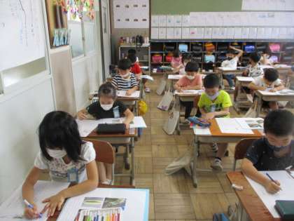 国語科「うみのかくれんぼ」で,かくれんぼ図鑑をつくっています。自分のやりたい海の生き物を決めて,つくっているところです。みんな真剣な表情で書いています。すてきですね。