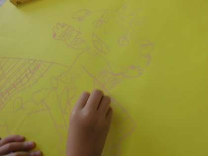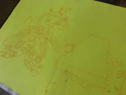 思い思いの色画用紙に,主人公のナーラ姫をえがき,まわりにいる登場人物もえがいていきます。ナーラ姫は,明るい元気なお姫様です。動きのあるいきいきしたナーラ姫が描かれています。
