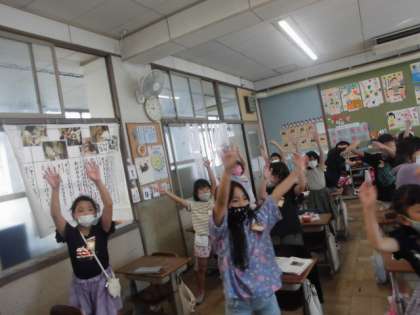 6年生が作ってくれた全校ダンスのビデオを見て,みんなで練習しました。音楽がなるとのりのりで練習しています。