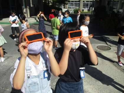 理科の学習で,太陽と地面のようすについて学習しています。かげの反対には太陽があると確認するために,遮光版で太陽の位置を観察しました。