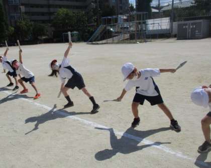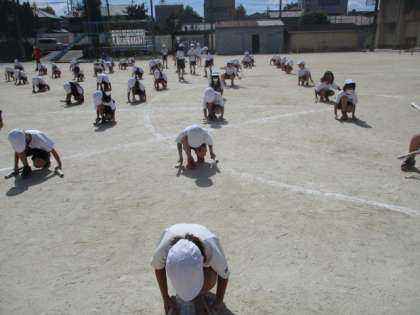 2年生で学年練習をしました。初めて,ばちを持っておどりました。