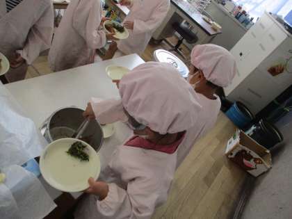 今日のサバの味噌煮と大根葉のごまいためは,初めて子どもたちによそってもらいました。