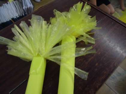 砂リンピックで「ししのまい」をおどるときの,ばちが完成しました。朝からみんなうれしそうです。体育の時間を待ちきれず,教室でばちをもって踊っていました。
