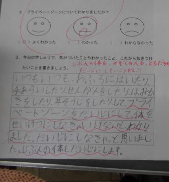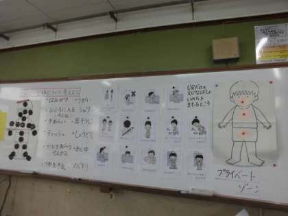 せいけつな体について学習しました。よく汚れる体の部分を話し合ったあと,せいけつな体を保めのおふろでの体の洗い方について学びました。体のプライベートゾーンについて知り,命につながる大切なところであることを学習しました。