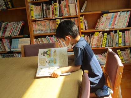 図書館でほっと一息,静かに本を読んでいる様子です。