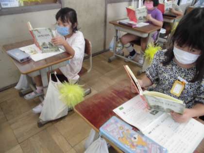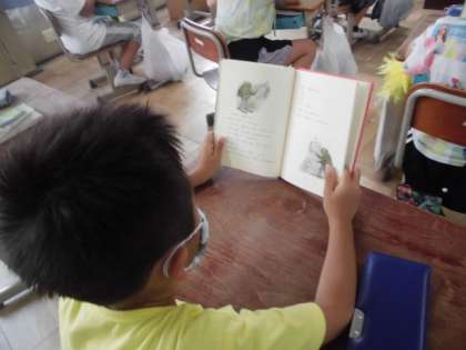 「『がまくんとかえるくん』シリーズのお気に入りのお話の音読げきを楽しもう。」という単元のめあてを設定し,学習をスタートしました。今までも音読劇をした経験のある子どもたちですが,今回は登場人物の気持ちを想像して,表現できるようにします。図書室にがまくんとかえるくんシリーズの新しい本がいっぱいありました。一人1冊あり,とてもうれしそうに本を手にとり読んでいました。