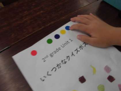 いくつかなクイズの学習の最後の時間です。ポスターを作って,数を尋ねたり,答えたりします。ペアをかえて何回も交流しました。交流していくうちに,慣れてきて自信をもって話すことができるようになりました。交流するたびに,シールをはりました。学習したことを生かしてシールの数をone,two…と数えていることに感心しました。