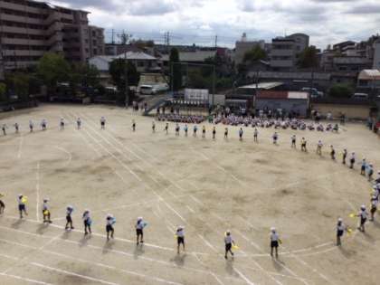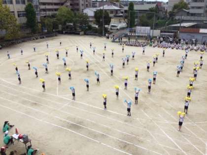 3年生の演技は「みんな笑顔になぁれ」でした。青と黄色のポンポンを上手に動かしながら,元気よく踊りました。BGMの「Make you happy」「スマイル」は,文字通り「笑顔」がテーマです。踊っている3年生も,見ている私たちも笑顔いっぱいになりました。