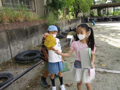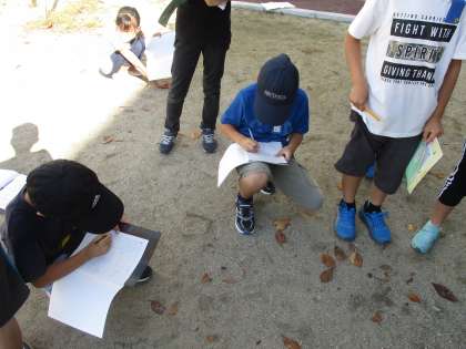 日かげと日なたを直接手で触ってみて,冷たさや湿り具合を確かめてみました。「日かげは冷たいよ。」「手で触ると,日なたの砂は乾いているけど,日かげの砂はしめっている!」と新しい発見がたくさんあったようです。日なたと日かげに落ちていた葉っぱにも違いがあることにも気付いていました。