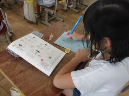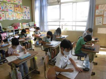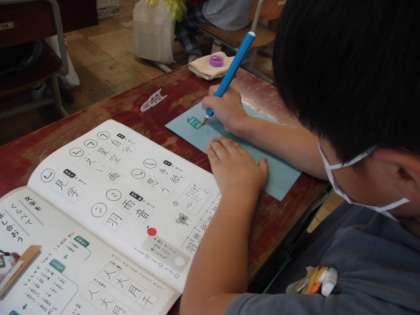 画の方向を意識して漢字を書きました。まずは水書で練習です。水書の字もとても丁寧になってきました。書写の時間は特に書くときの姿勢や鉛筆の持ち方に気を付けるようにしています。