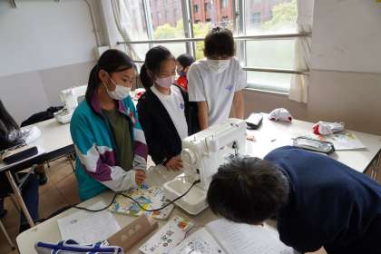 初めて触るミシンなので,すぐに一人ではできません。こんな時は「思いやりの心」ですね。友達どうしで協力しながら取り組む姿は,素敵でした。