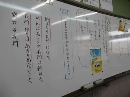 道徳の学習で長所が見つからない主人公が,様々な人とのやり取りの中で「長所は作ればいいんだ。」と学んでいくお話を学習しました。