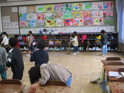 子どもたち同士で,「ほうきはくよ。」や「ぞうきんさん,おねがいします。」,「つくえはこびさんでてきて。」と声を掛け合い,教室掃除を進めてくれています。