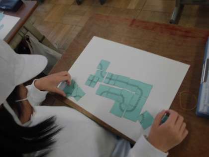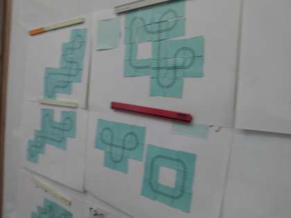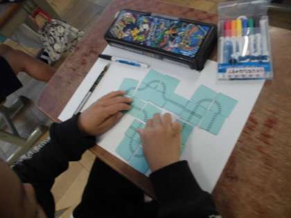 線路のカードを組み合わせて,ぐるっと回る線路を作りました。つなぎ方を考え,いろいろな線路が出来上がりました。ひとりでじっくり考えて作っていました。