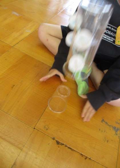 坂道をそっと置いておくと,「転がしてみよう」とおもちゃを転がしてみたり,競争させたりしていました。