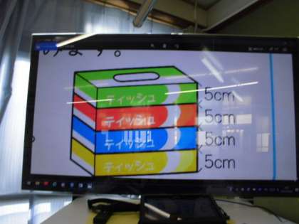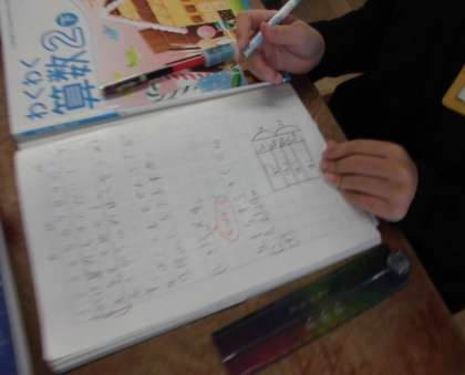 かけ算の答えは,たし算で求めることができることについて学習しました。式や計算の答えを書くだけでなく,図をかいて説明しています。しっかりかけ算の意味をとらえることができるようにしています。