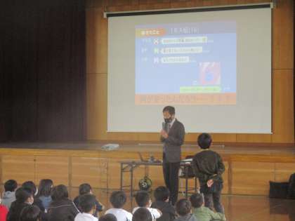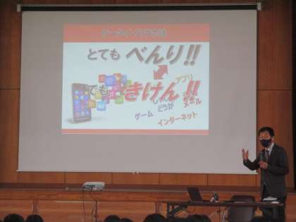 今日はKDDIの方に来ていただいて,ケータイやスマホの使い方について学習しました。メールやLINEのやり取り,アプリの課金についてなど実際に起こったトラブルをもとに話していただきました。