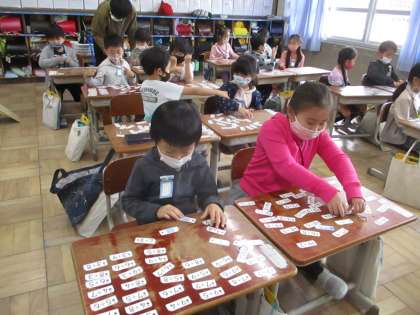子どもたちは,「しきはちがうのに,こたえがおなじカードがいっぱいある。」,「9+9のカードとおなじこたえのカードは9+9しかないね。」と気付いたことを話しながら取り組んでいました。