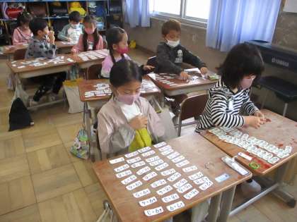 答えが10より大きい数のたしざんの計算カードを使って,答えが同じカード見つけをしました。