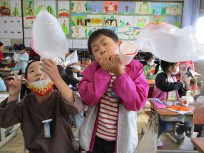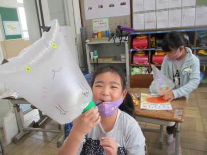 今日の図画工作科「にょきにょきとびだせ」では,袋を膨らませるしくみから,思いついたものを作りました。絵を描いたり,折り紙をつけたりした後,袋を膨らませました。ぷうっと袋が膨らむのが楽しいみたいで,出来上がりをとても喜んでいました。