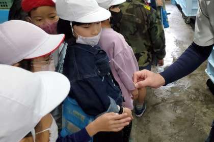 工場見学では,糸こんにゃくを作っているところを見学させていただきましたが,乾燥した状態の糸こんにゃくも触らせていただきました。子どもたちは,指で弾いて楽しんでいました。