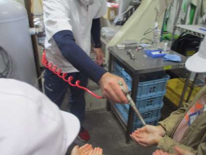 矢野食品の工場では,機械を圧縮した空気の力で動かしているそうで,実際に空気を手に当てていただきました。圧縮された空気の力を肌で感じて,大盛り上がりでした。