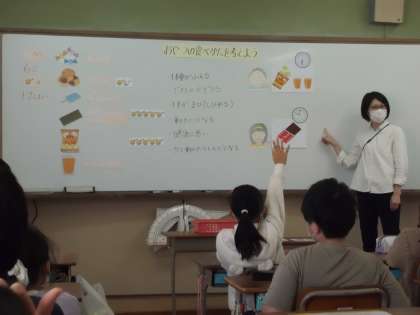 お菓子やジュースなどに含まれる砂糖や油の量を教えていただき,食べ方や食べる時間をどのようにしたらよいかを教えていただきました。