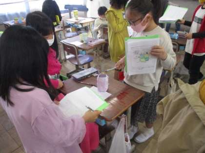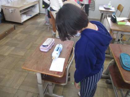 参観日で掲示していた「あきようきのへんしん」で作った作品を,お友達と交流しました。空き容器の組み合わせ方や,色の使い方など,様々な視点から友達の作品を鑑賞する姿がみられました。