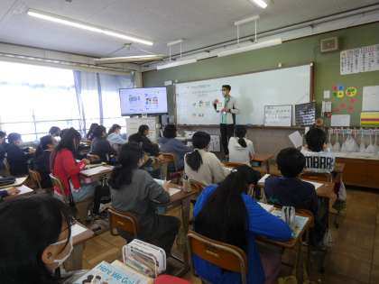 外国語では自分たちの町にあるものや,ないものを伝えて自分の町について紹介しようという学習をしています。